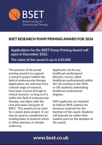 The Pump Priming award is to support a research project within the field of endovascular therapy. The award can be used for a stand-alone project, or to compliment an existing body of research which is either planned, or already underway.
